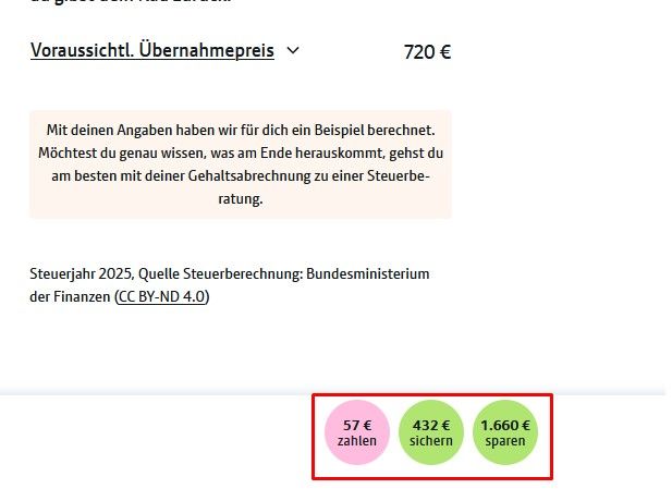Ohne Bewertung: Die drei Links (auf farbigen kreisförmigen Flächen) "Zu zahlst ...", "Dein Arbeitgeber zahlt ..", "Du sparst ..." wären aussagekräftiger, wenn hier deutlich würde, dass es sich um Sprunglinks zu den entsprechenden Bereichen handelt. Es könnte ein