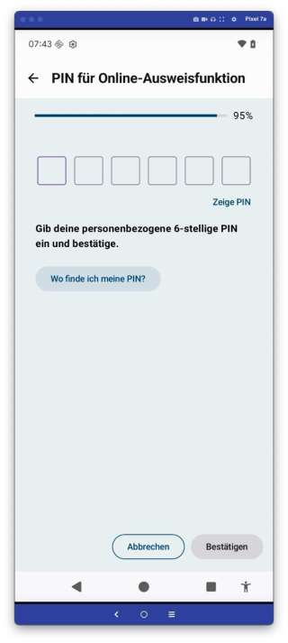 Anmerkung: Wenn die PIN mithilfe des Screenreaders in das Eingabefeld eingegeben wird (ohne angeschlossene externe Tastatur), erfolgt keine Rückmeldung über die eingegebene Ziffer. Nutzende erhalten dadurch kein Feedback, ob und welche Zahl tatsächlich erfasst wurde. Das führt zu Unsicherheit, da nicht überprüft werden kann, ob die Eingabe korrekt ist.