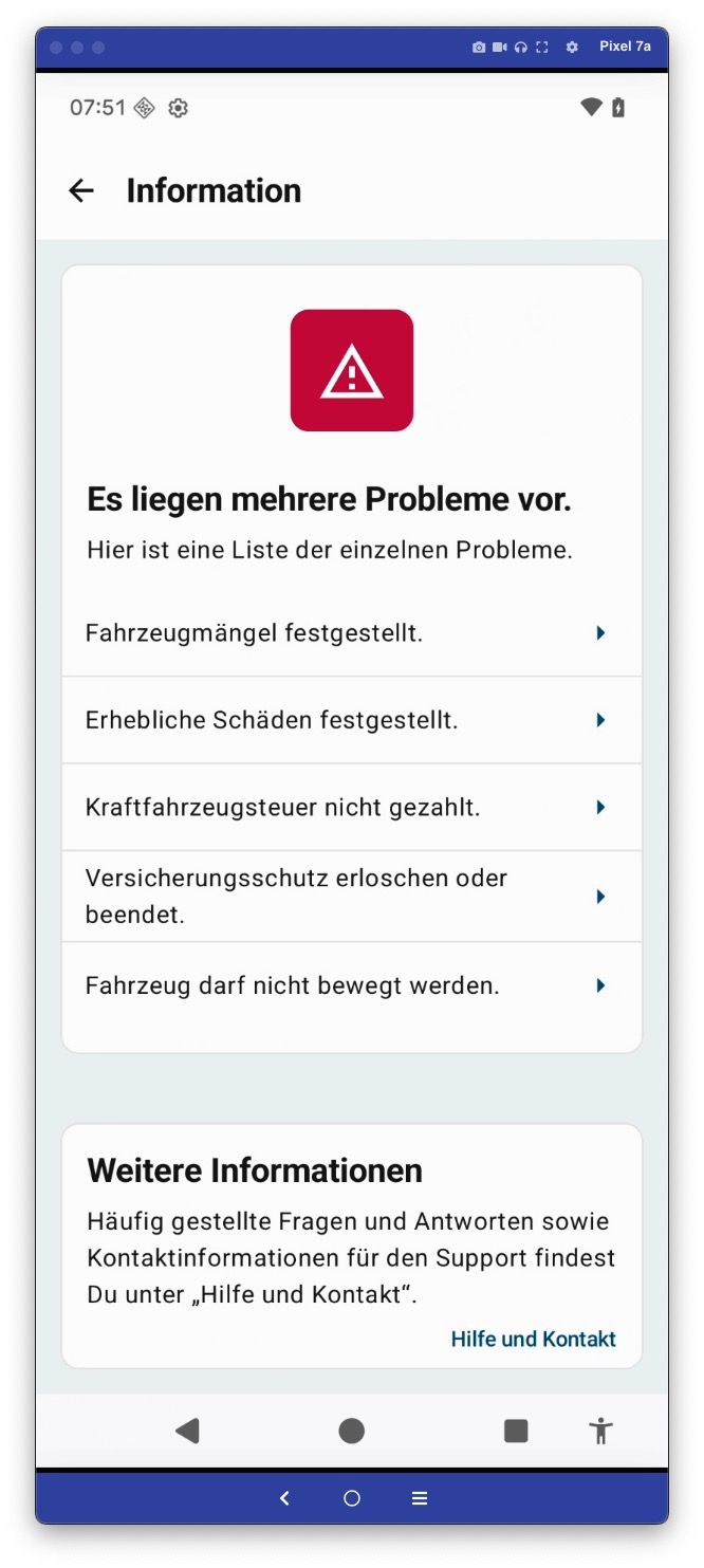 Anmerkung ohne negative Bewertung: Um von der Überschrift „Information“ zur Überschrift „Es liegen mehrere Probleme vor“ zu navigieren, sind mit dem Screenreader statt einer zwei Wischgesten erforderlich. Vermutlich erhält dabei ein visuell verborgenes Element den Fokus, das für Nutzende nicht sichtbar ist. Es wird empfohlen, dieses Problem zu beheben.