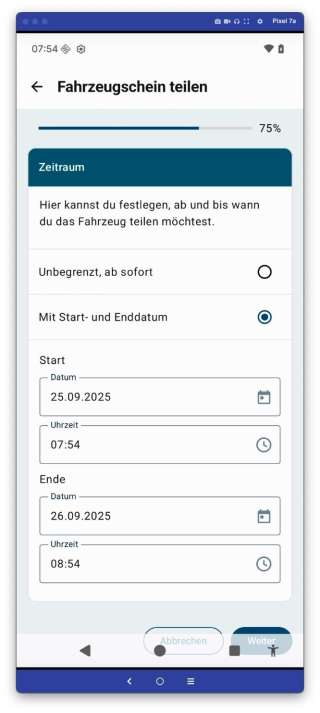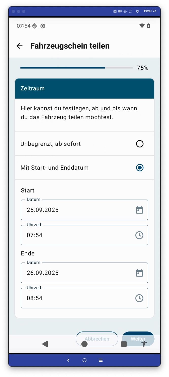 Anmerkung ohne negative Bewertung: Auf der Seite befinden sich zwei identische Überschriften „Fahrzeugschein teilen“, die direkt hintereinander stehen, ohne dass dazwischen Text erscheint. Dies kann Nutzende irritieren und sollte nach Möglichkeit vermieden werden. Überschriften sollten eindeutig sein und die nachfolgenden Inhalte klar beschreiben. Eine Option wäre, die zweite Überschrift statt „Fahrzeugschein teilen“ beispielsweise „Möglichkeiten zum Teilen“ zu nennen.