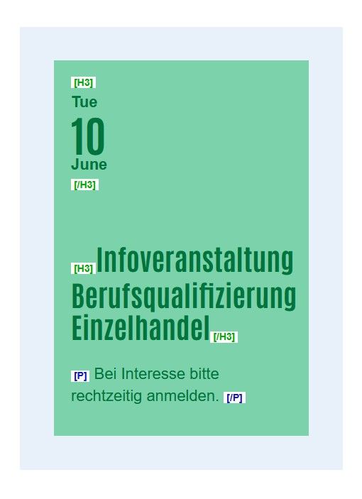 Ohne Bewertung: Im Testzeitraum wurden hier Termine angezeigt, die bzgl. Überschriftenauszeichnung mangelhaft waren (siehe Screenshot: Sowohl das Datum, wie auch den Eintrag wurde jeweils als