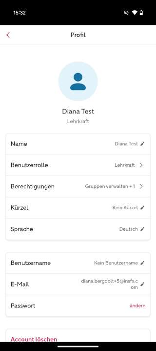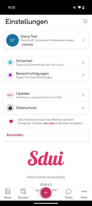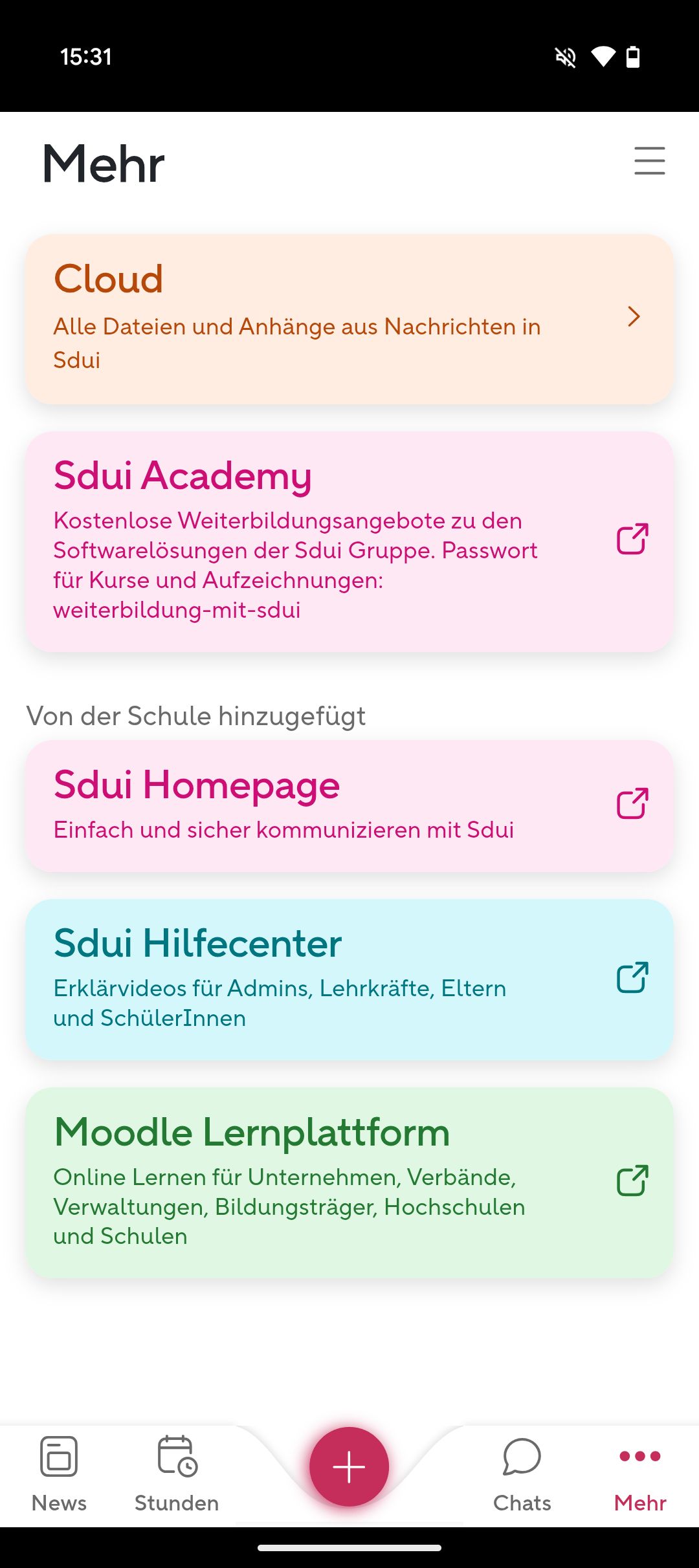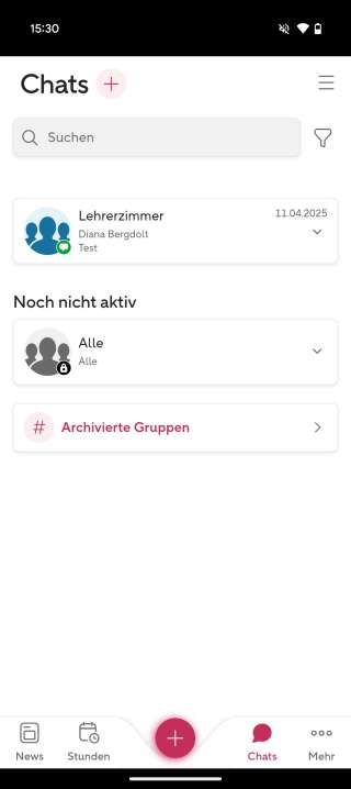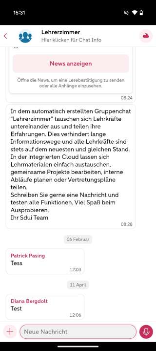 Mithilfe der Karten (z. B. "Lehrerzimmer") ist es möglich, den Chat zu öffnen. Diese Funktion ist bei aktiviertem Screenreader nicht eindeutig erkennbar. Die Ausgabe lautet beispielsweise "Lehrerzimmer, Taste". Hier wäre es empfehlenswert zusätzlich den Hinweis "Zum Öffnen des Chats Lehrerzimmer doppeltippen" zu ergänzen.