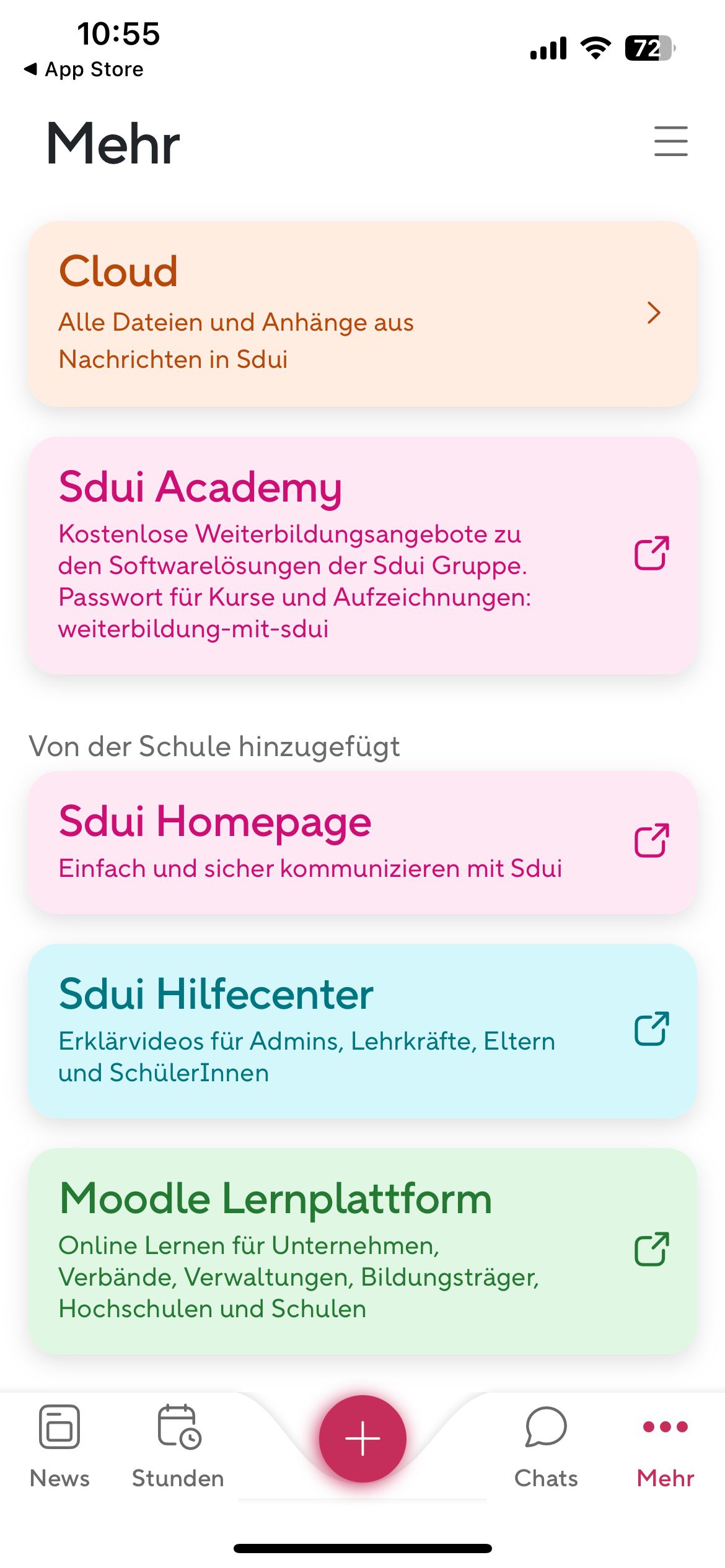 Bei den Kästen mit externen Links werden Überschrift (z. B. "Sdui Academy") und der darunter stehende Text zwei einzelne Fokuspunkte. Damit die Zusammengehörigkeit für Screenreader-User eindeutig verständlich ist, sollte der gesamte Kasten nur ein Fokuspunkt sein (gleiche Umsetzung wie der Kasten "Cloud").