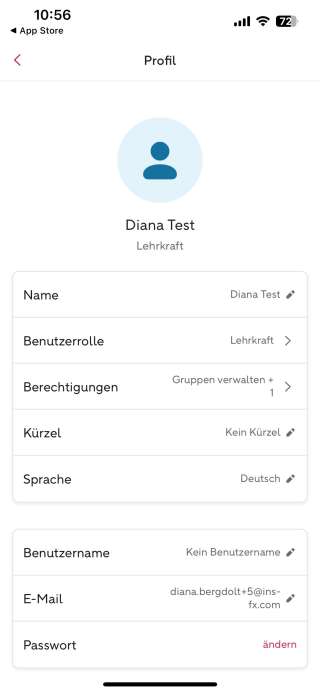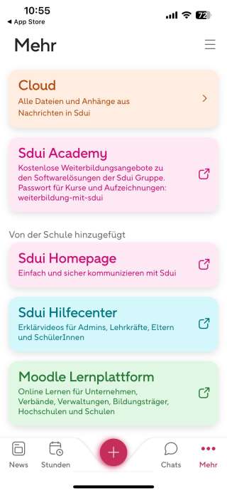 Mithilfe der Karten (z. B. "Lehrerzimmer") ist es möglich, den Chat zu öffnen. Diese Funktion ist bei aktiviertem Screenreader nicht eindeutig erkennbar. Die Ausgabe lautet beispielsweise "Lehrerzimmer, Taste". Hier wäre es empfehlenswert zusätzlich den Hinweis "Zum Öffnen des Chats Lehrerzimmer doppeltippen" zu ergänzen.